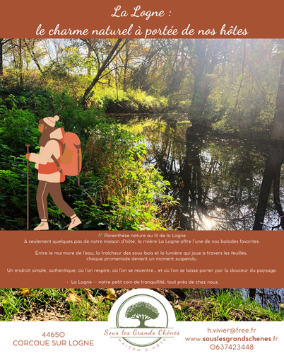 Profitez d’une balade au grand air, respirez la sérénité des lieux et laissez-vous séduire par la quiétude de notre maison d'hôtes, nichée à deux pas de la rivière la Logne et du lac de Grand Lieu.